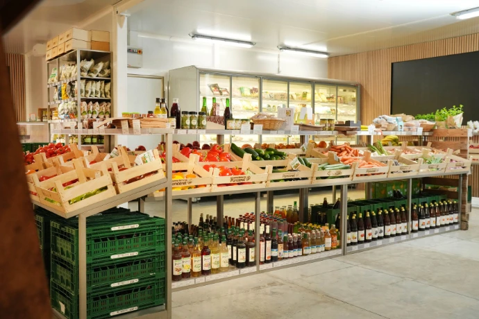 Le magasin vend la production du maraîchage et des produits d'autres fermes de la région. Le reste de la gamme est complétée par des fournisseurs bio.